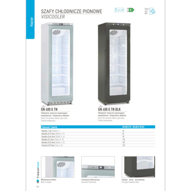 Prezentowany model ma pojemność użytkową 400 l oraz pięć półek idealnych do wystawienia takich produktów jak napoje, jogurty, sery, wędliny czy jaja. Maksymalne obciążenie każdej  z nich to w tym przypadku 35 kg. Na odpowiednią jakość prezentacji korzystnie wpływa pionowe oświetlenie LED umożliwiające jeszcze lepsze wyeksponowanie sprzedawanych artykułów. Umieszczone w środku produkty są doskonale widoczne dzięki zastosowaniu samozamykających drzwi bez ramkowych, wyposażonych w odporną i bezpieczną dla klientów i pracowników szybę ze szkła hartowanego.